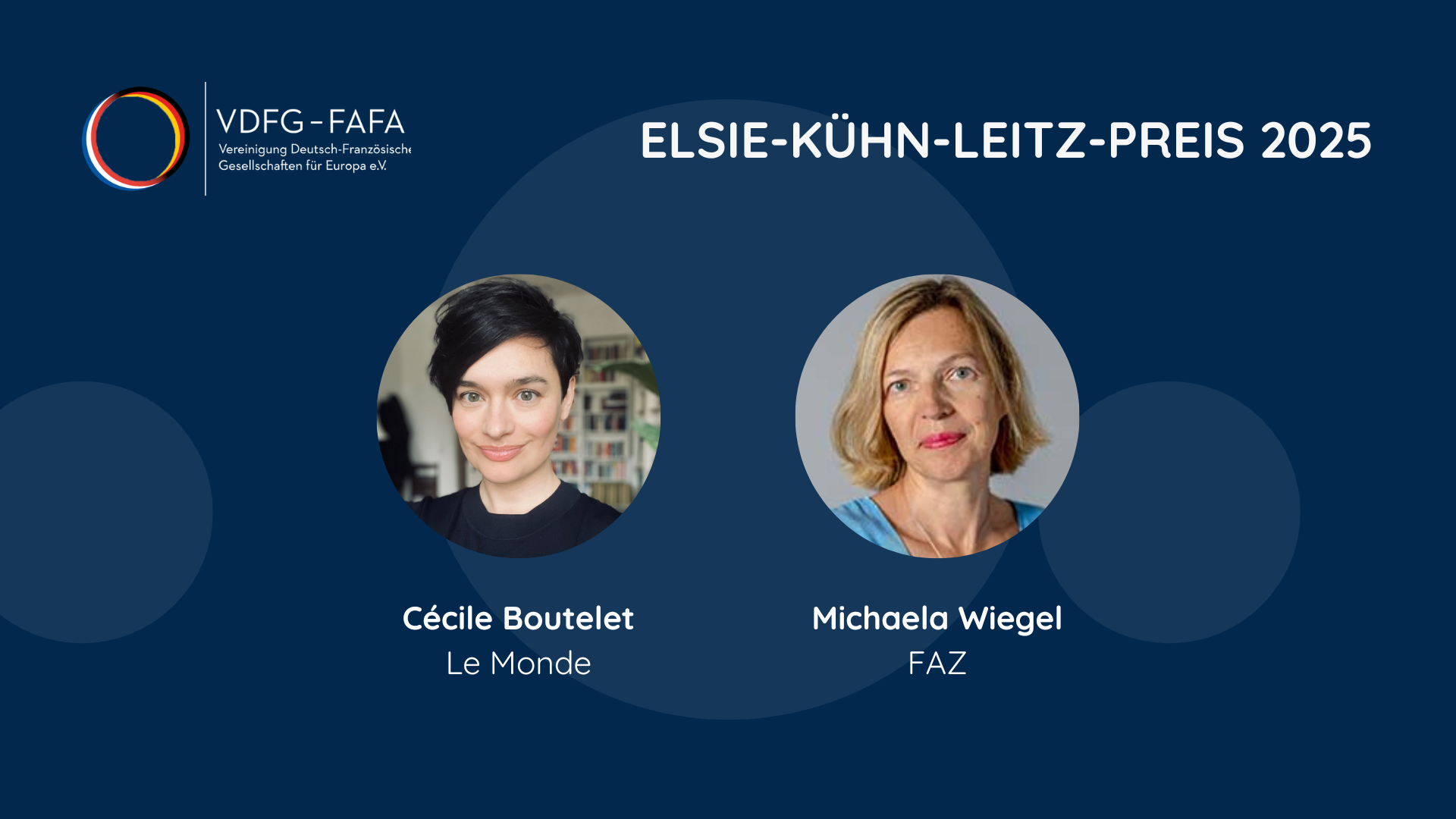 Nach drei Jahren wurde wieder der mit 10.000 € dotierte Elsie-Kühn-Leitz-Preis (EKLP) verliehen. Preisträgerinnen sind diesmal die politische Korrespondentin der Frankfuirter Allgemeinen Zeitung in Paris, Michaela Wiegel, und die Wirtschaftskorrespndentin von „Le Monde“ in Berlin, Cécile Boutelet. Die neu gewählte VDFG-Vizepräsidentin Sylvaine Mody und der Vorsitzende unseres Kuratoriums, Dr. Oliver Nass, Enkel von Dr. Elsie Kühn-Leitz, haben den Preis beim diesjährigen Jahreskongress von FAFA und VDFG in Nantes am 17. Oktober übergeben.