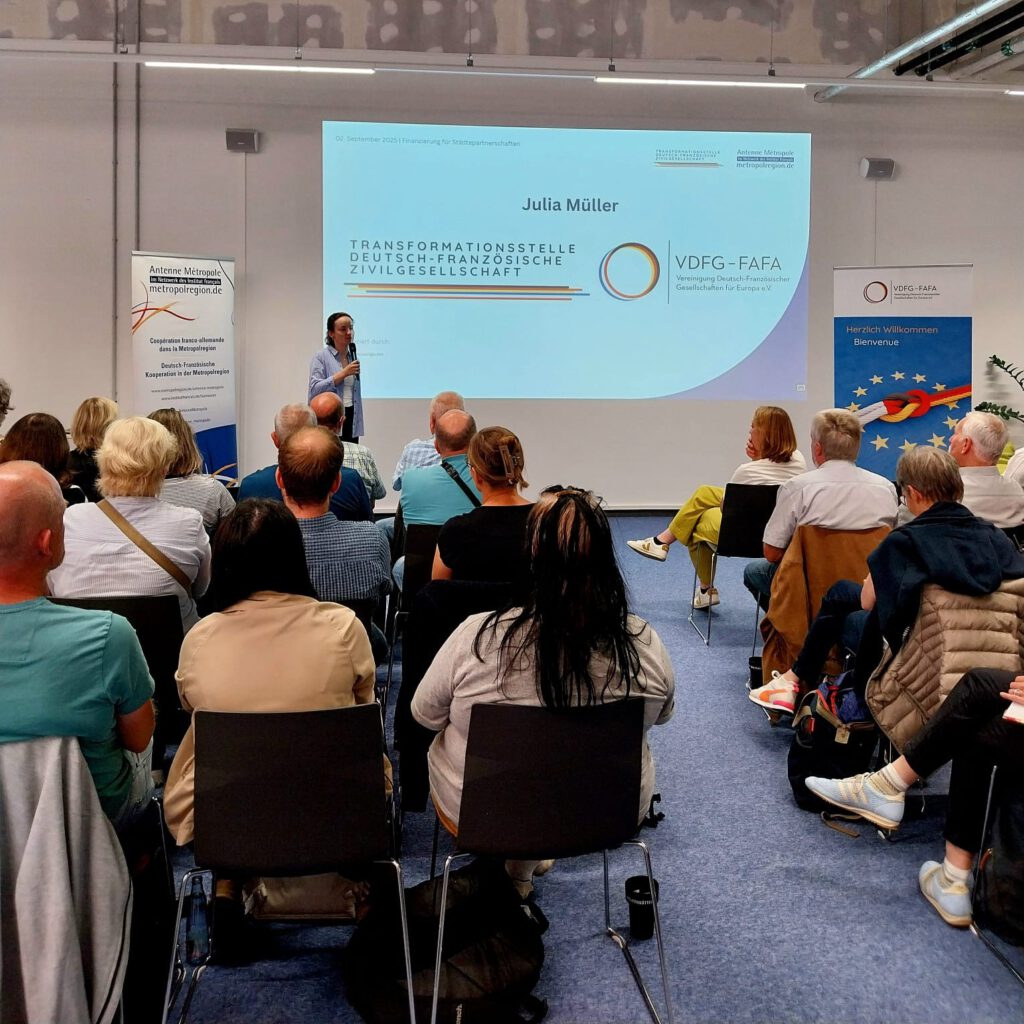 Seit Juni 2024 hat die Projektbeauftragte für die Transformation der deutsch-französischen Zivilgesellschaft Julia Müller Vereine und andere Organisationen mit Blick auf die Stärkung und Weiterentwicklung ihrer Strukturen und Projekte begleitet und beraten. Dank einer Projektförderung des Auswärtigen Amtes gab es somit für 19 Monate – und zum ersten Mal in der Geschichte der VDFG – eine hauptamtliche zentrale Anlaufstelle für Engagierte, die sich mit den vielfältigen Zukunftsthemen ihrer zivilgesellschaftlichen Arbeit auseinandersetzen wollen. In diesem Artikel haben wir bereits über das erste Jahr der Transformationsstelle berichtet. Im Folgenden erfahren Sie, welche Projekte im zweiten Halbjahr 2025 durch die Projektbeauftragte realisiert und welche Impulse zur Transformation gesetzt werden konnten.